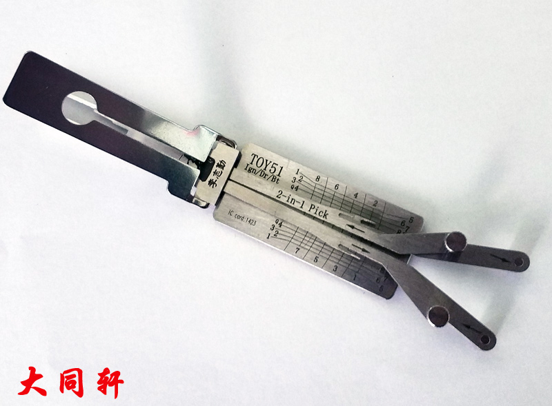 备注:TOY51,本是设计为欧洲丰田车用,为内铣四轨迹;但是测试国产的猎豹CS10,陕汽红岩,德龙等都能开启;并且一些国产内铣两轨迹无对应二合一(只用一组两个撬杆)也能兼容开启;只是要注意,因为这个工具头比较长,兼容开启时定位要注意位置!