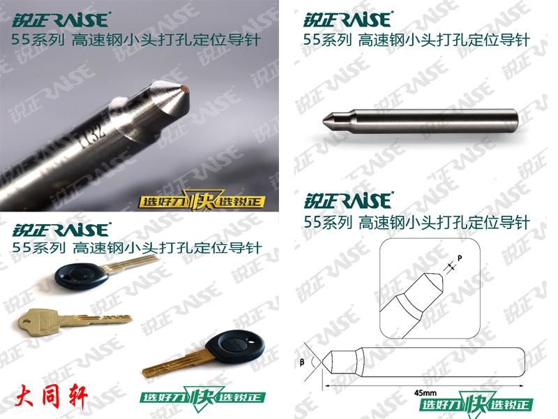 立式钥匙机使用扁钻打孔的导针。一般建议直接使用这种小头形状做导针即可;一般推荐90°和95°两种最为常见;