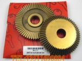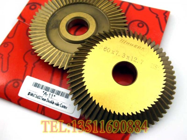 刀片直径60mm,刀片厚度7.3mm,中心孔直径12.7mm(60齿),经过一整套加工工艺和热处理,并全部镀钛。硬度达到65HRC以上;60牙属于中等密齿型,精密配制各类铜钥匙的操作;中心孔12.7mm通用于各类型双头卧式配钥匙机器。
