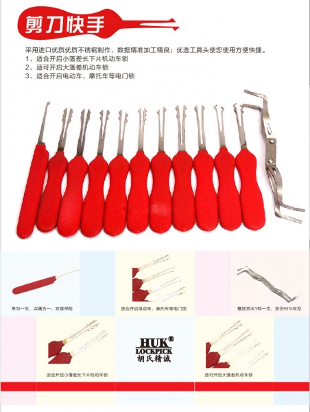 由HUK最新推出的新款剪刀快手式工具。工具整体保持原前主流的几种牙花配制,也添加了一支单钩,专门针对HON66 类配合Y档直接点片开启。
