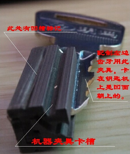 每套夹具由从左至右一共有4个夹具构成。每个夹具上下都有一条和钥匙一样的方形凹槽;这样(夹住玥玛钥匙的夹具)卡在钥匙机上。其方便程度和精准定位特征和(普通一字钥匙)没有任何区别。其中左面(可以看出带有一样的凹痕标识)两个是完全一样的,用来分别夹持钥匙和钥匙坯配制凹面朝上的左面钥匙齿形;