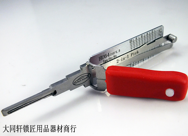 二合一工具在锁匠圈内是由来已久,不再复述其功能作用;此次上架销售的是佳乐提供了一种改良款。首先最主要的一点就是解决夜晚使用,无法得到照明的问题;加之面板表层技术处理后光源反射不刺眼;其次推动杆手柄处加宽加厚并作防滑处理,解决使用中用手指推动时间长后手指疼痛的尴尬;