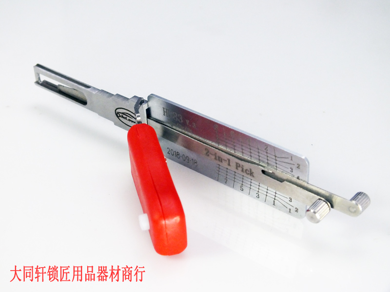 二合一工具在锁匠圈内是由来已久,不再复述其功能作用;此次上架销售的是佳乐提供了一种改良款。首先最主要的一点就是解决夜晚使用,无法得到照明的问题;加之面板表层技术处理后光源反射不刺眼;其次推动杆手柄处加宽加厚并作防滑处理,解决使用中用手指推动时间长后手指疼痛的尴尬;