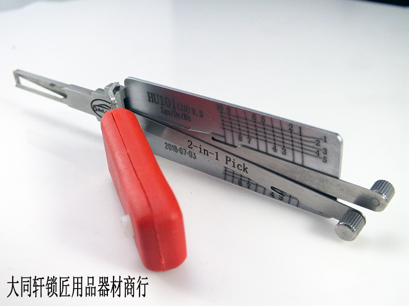 二合一工具在锁匠圈内是由来已久,不再复述其功能作用;此次上架销售的是佳乐提供了一种改良款。首先最主要的一点就是解决夜晚使用,无法得到照明的问题;加之面板表层技术处理后光源反射不刺眼;其次推动杆手柄处加宽加厚并作防滑处理,解决使用中用手指推动时间长后手指疼痛的尴尬;